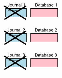 For brevity, the diagrams in this section are simplified from those that came before. Blue color still signifies original content and pink still signifies new content. But the individual pages in the rollback journal and the database file are not shown and we are not making the distinction between information in the operating system cache and information that is on disk. All of these factors still apply in a multi-file commit scenario. They just take up a lot of space in the diagrams and they do not add any new information, so they are omitted here.