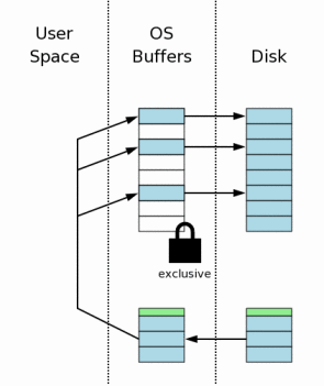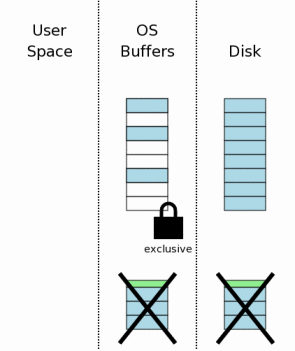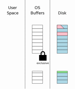 The state of the computer when a database connection is first opened is shown conceptually by the diagram at the right. The area of the diagram on the extreme right (labeled "Disk") represents information stored on the mass storage device. Each rectangle is a sector. The blue color represents that the sectors contain original data. The middle area is the operating systems disk cache. At the onset of our example, the cache is cold and this is represented by leaving the rectangles of the disk cache empty. The left area of the diagram shows the content of memory for the process that is using SQLite. The database connection has just been opened and no information has been read yet, so the user space is empty.