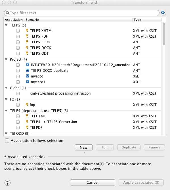 From these, tick (for example) the box by ‘TEI P5 XHTML’ and click on Apply associated.