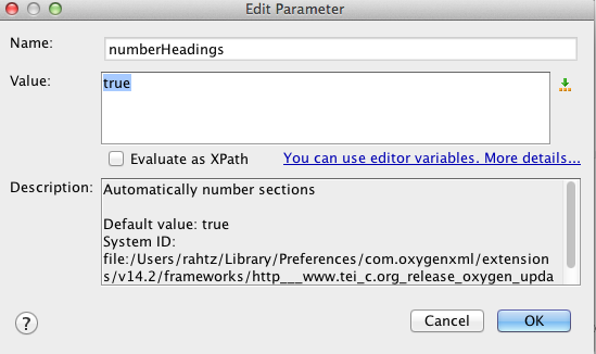 Restart oXygen, and check that TEI support is still there. You can now edit your copy of the stylesheets, by creating (for example) a new profile directory, in tei/xml/tei/stylesheet/profiles. For example, to create your local profile for Word to TEI, create and a directory called local, and under that one called docx. In there, create a file called from.xsl which looks like this: